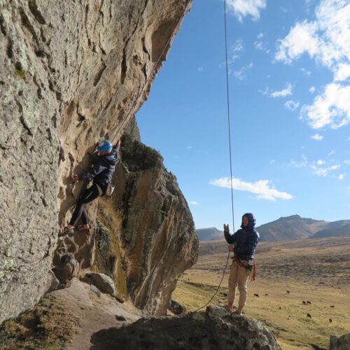 In Huaraz we have many Rock Climbing and Bouldering zones. We have various types of rock such as sedimentary, granite, sandstone, volcanic conglomerate, etc. In many places, the routs are already bolted. We organize one-day and several-day excursions and courses in different places. The activities that we offer are twofold: For beginners we have places to learn and practice basic skills. There are also more technical spots, recommended for more experienced climbers, where you can improve your climbing ability or just have fun practicing this lovely sport. Lastly, we offer climbing courses on perfect rocks.